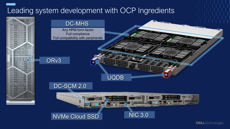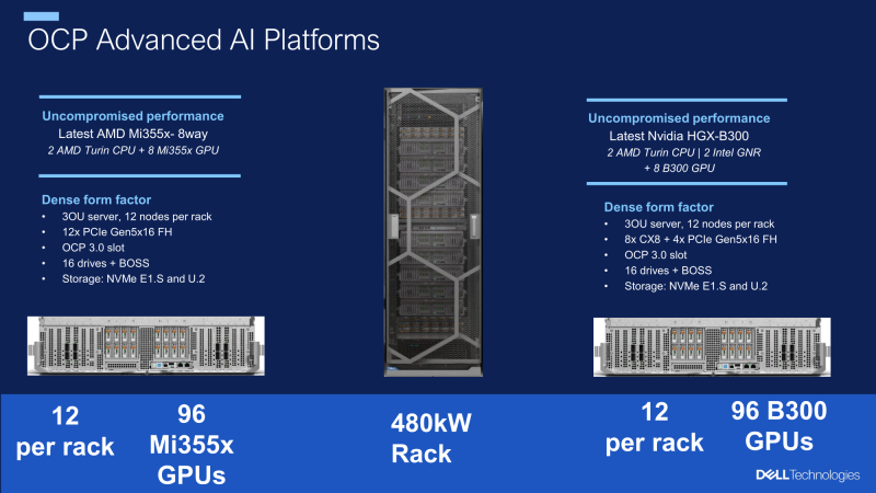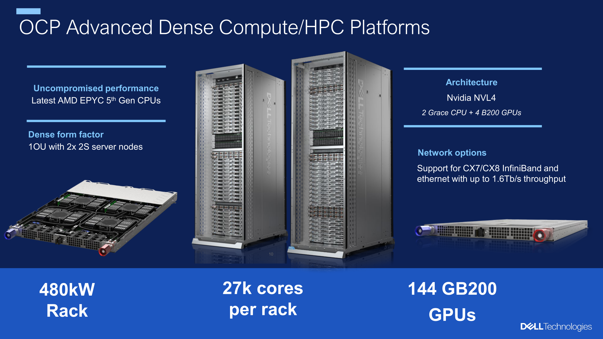 Dell разработала модульные OCP-стойки мощностью 480 кВт для ИИ-системКомпания Dell в ходе мероприятия 2025 OCP Global Summit рассказала о разработке передовых систем для ресурсоёмких нагрузок ИИ и HPC. Речь идёт, в частности, о полностью модульных архитектурах на базе открытых спецификаций, оптимизированных для жидкостного охлаждения. Ихаб Тарази (Ihab Tarazi), главный технический директор и старший вице-президент Dell Technologies, сообщил, что компания установила сотни тысяч GPU-ускорителей в кластерах, использующих оборудование на основе стандарта OCP ORv3. Благодаря достижениям в области водоблоков, термоинтерфейсов, блоков распределения охлаждающей жидкости (CDU) и быстроразъёмных коллекторов упрощается развёртывание масштабных ИИ-платформ, насчитывающих десятки тысяч GPU. Кроме того, Dell совместно с Национальной лабораторией имени Лоуренса в Беркли (LBNL) при Министерстве энергетики США (DoE) разработала модульную OCP-стойку мощностью 480 кВт с возможностью дальнейшего масштабирования до 1 МВт. Решение, ориентированное на экстремальные нагрузки ИИ, допускает установку высокопроизводительных серверов, насчитывающих в общей сложности до 27 тыс. CPU-ядер и до 144 ускорителей NVIDIA GB200. В перспективе также могут использоваться чипы AMD и NVIDIA следующего поколения, такие как Instinct MI450 и Vera Rubin. По словам Тарази, аналогичная архитектура стоек применяется в рамках суперкомпьютерной программы Техасского университета в Остине (UT Austin) и при развёртывании суверенных облаков. В целом, модульный подход обеспечивает возможность независимой модернизации вычислительных ресурсов, хранилищ и сетевых компонентов, сокращая время обновления инфраструктуры с нескольких лет до нескольких недель. Инновации в сфере СЖО повышают надёжность и удобство обслуживания платформ в рамках масштабных ИИ-кластеров.